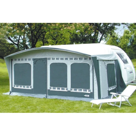 Veranda per roulotte con tetto in poliestere bispalmato PVC (530gr/mq), cavetto termosaldato, pareti laterali in tessuto poliestere bispalmato PVC Mehler da 480 gr/mq e paleria in alluminio anodizzato (diam. 26mm).