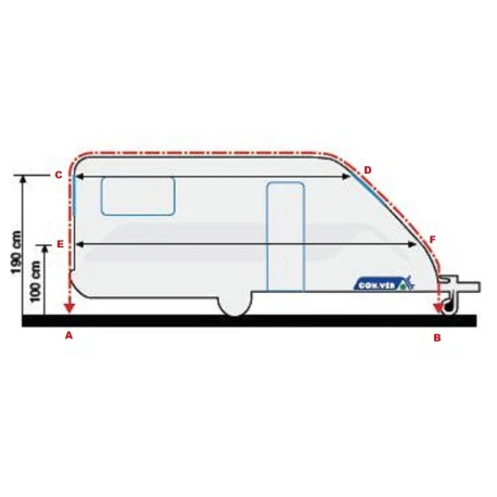 Per conoscere la taglia corretta per la tua roulotte è sufficiente misurare il perimetro A-B (da terra a terra) assicurandosi di avere la caravan parcheggiata su terreno piano: in alcuni casi possono essere necessarie le misure C-D (interasse ad 1,90m di altezza da terra) ed E-F (interasse ad 1,00m di altezza da terra).